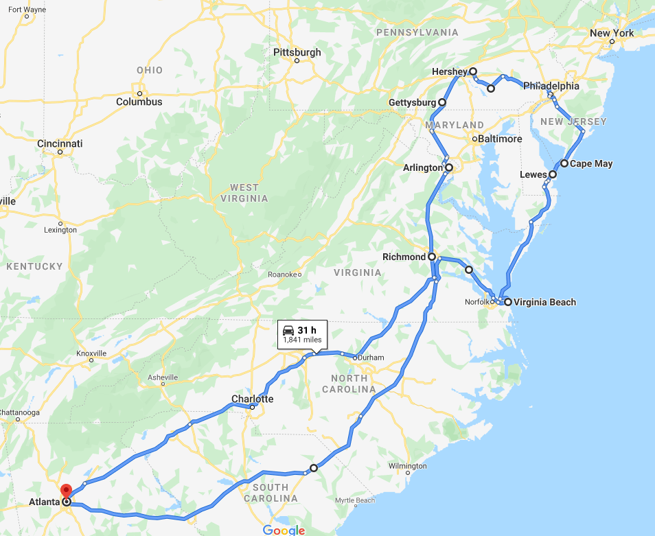 Upon leaving Virginia we made our long trek back to Atlanta with one of my children playing a penny whistle for hours upon hours that I stupidly let her purchase with her souvenir money. This trip was 31 hours total in the car and the girls did great…most of the time anyway. The only long portions without stopping for the evening were between Georgia and Virginia, so this is another one that is very doable, even with young children. Its a great route to see a lot of our nation’s history without breaking the bank!